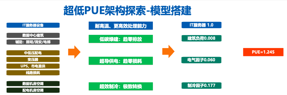 熟悉設(shè)計(jì)流程的專業(yè)人員都知道,數(shù)據(jù)中心里主要的設(shè)備是包含風(fēng)電、制冷、IT,都屬不同專業(yè)、不同團(tuán)隊(duì)的人來(lái)設(shè)計(jì)實(shí)施。其中,絕大部分設(shè)計(jì)院也不設(shè)計(jì)IT部分,而IT的負(fù)載通常是恒定值。為此,深總院搭建的能耗模型主要分為三個(gè)部分:建筑、電氣、制冷。從綠色建筑層面來(lái)講,目前低碳綠建趨勢(shì)下,排放的趨勢(shì)趨零。因此,降低PUE主要集中在電氣和制冷兩個(gè)層面:在電氣領(lǐng)域,需要高能效的設(shè)備和最短的傳輸;在空調(diào)系統(tǒng)也是如此,超高效制冷,極致轉(zhuǎn)換,這兩個(gè)領(lǐng)域本質(zhì)上都是將最簡(jiǎn)單的設(shè)備和最低的功耗結(jié)合起來(lái),每一部分的PUE都控制到一定數(shù)值,最終實(shí)現(xiàn)整體PUE值的降低。