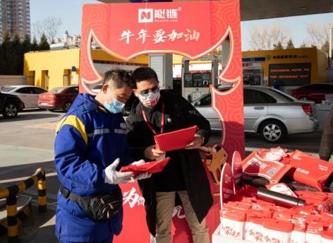 北京,能鏈聯合創始人兼CEO王陽為加油員送上春節紅包