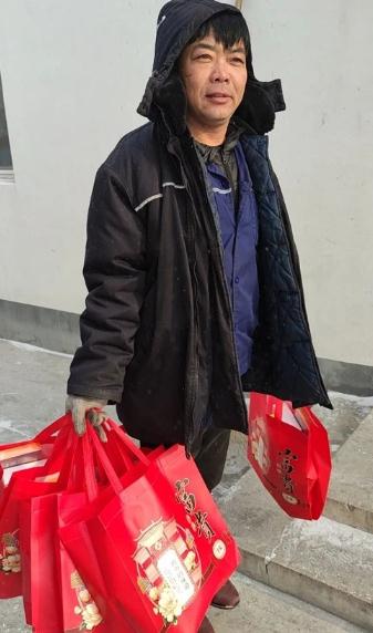 內蒙古興安盟,油站站長拎著于治浩送去的新年禮包,臉上洋溢著幸福的微笑