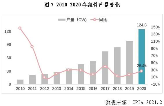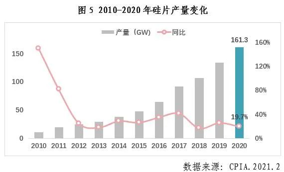 盡管受到年初的疫情沖擊、7-8月多晶硅料企業安全事故及新疆地區疫情導致的硅料供應緊張、以及7月開始由于光伏玻璃、EVA膠膜等供應緊張導致的原輔材料價格上漲等黑天鵝事件,我國光伏產業在國內外市場的推動下,規模持續擴大。其中,多晶硅產量39.2萬噸,同比增長14.6%;硅片產量161.3GW,同比增長19.7%;電池片產量134.8GW,同比增長22.2%;組件產量124.6GW,同比增長26.4%。