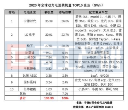 GGII數據顯示,2020年全球動力電池裝機量TOP10企業依次是寧德時代、LG能源、松下、比亞迪、三星SDI、SKI、中航鋰電、遠景AESC、國軒高科和億緯鋰能。