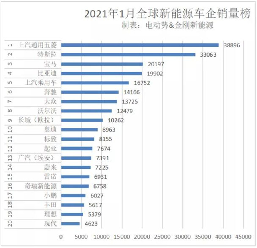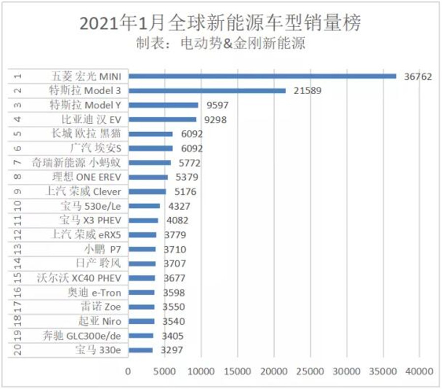 由于每月全球榜單是由累計銷量評定,而五菱和這三大新勢力幾乎是在去年下半年開始爆發,所以他們的威力在去年前20榜單并未集中體現。直到今年1月,大家都只有一個月的數據,五菱和三家新勢力才一起登榜,成就一段輝煌。