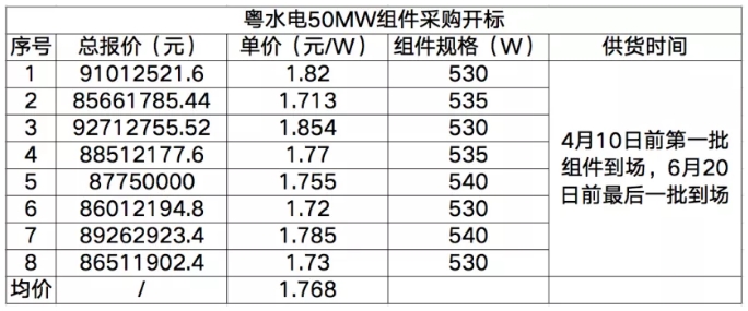 3月10日,遂溪縣粵水電官田水庫(kù)50MW光伏項(xiàng)目組件采購(gòu)開(kāi)標(biāo),共8家組件企業(yè)參與投標(biāo)。本次招標(biāo)組件規(guī)格為530W以上單晶雙玻組件,最高投標(biāo)報(bào)價(jià)為1.854元/W,最低報(bào)價(jià)為1.713元/W,均價(jià)為1.768元/W。具體開(kāi)標(biāo)價(jià)格見(jiàn)下: