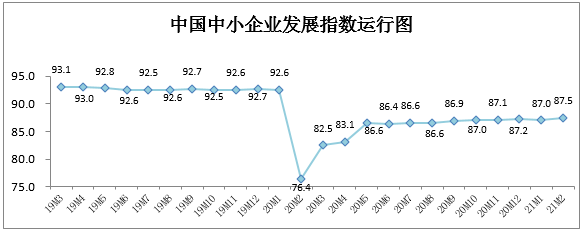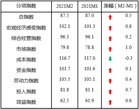中國(guó)中小企業(yè)協(xié)會(huì)今天(10日)發(fā)布,2021年2月中國(guó)中小企業(yè)發(fā)展指數(shù)(SMEDI)為87.5,環(huán)比上升0.5點(diǎn),扭轉(zhuǎn)了1月小幅回調(diào)態(tài)勢(shì),重返上升通道,處于去年2月以來(lái)最高位。其中,分行業(yè)指數(shù)全面上升,分項(xiàng)指數(shù)7升1降。