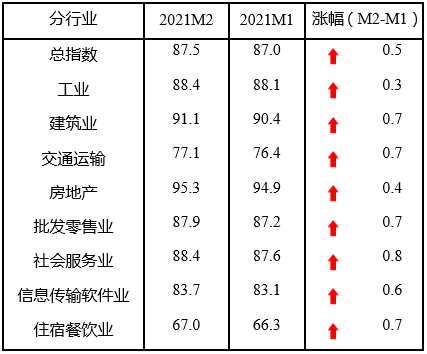 行業(yè)整體景氣狀況有所改善。工業(yè)、建筑業(yè)、交通運(yùn)輸郵政倉(cāng)儲(chǔ)業(yè)、社會(huì)服務(wù)業(yè)、信息傳輸軟件業(yè)和住宿餐飲業(yè)指數(shù)均由降轉(zhuǎn)升,房地產(chǎn)業(yè)指數(shù)連續(xù)兩個(gè)月上升,批發(fā)零售業(yè)指數(shù)由平轉(zhuǎn)升。