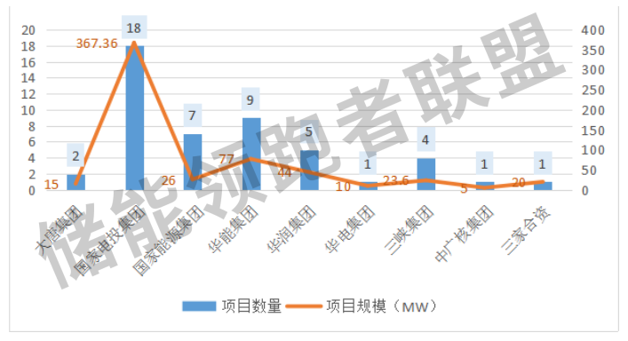 在上圖中,可以明顯看出國電投的儲能項目在地區分布上涵蓋較為廣泛,涉及11個省份地區,其中在青海有4個儲能項目,在湖南有3個儲能項目。其次是國家能源集團、中國華能集團、華潤集團都在5個省市地區投建有儲能項目,其中華能主要在內蒙古與山東有3個儲能項目,占比較大。