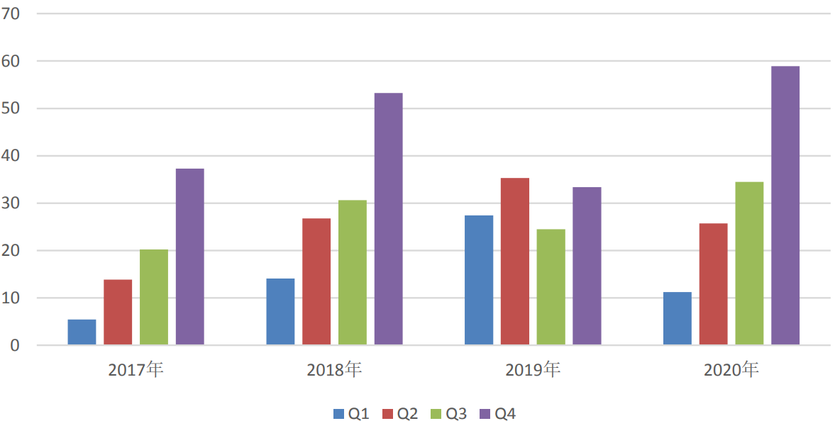 2017-2020年我國新能源汽車季度銷量情況(單位:萬輛,Q4為預測值)數(shù)據(jù)來源:中汽協(xié)