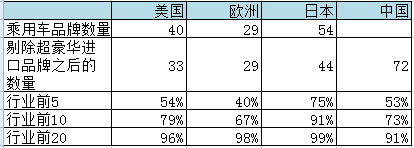 注:1、美國、歐洲、日本數(shù)據(jù)均為2018年,中國數(shù)據(jù)為2019年10月;2、國內(nèi)乘用車品牌數(shù)計算:一汽大眾和上汽大眾均算作大眾品牌;3、美國區(qū)域僅包含轎車;歐洲數(shù)據(jù)來自于歐盟和歐洲自由聯(lián)盟協(xié)會成員國數(shù)據(jù)之和;日本統(tǒng)計范圍為普通乘用車,不包含小型乘用車。