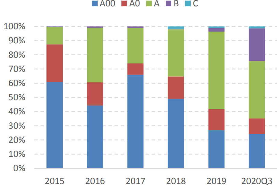 2020年1-9月,我國新能源汽車累計銷量達到71.4萬輛。而且,從銷量結(jié)構(gòu)來看,用于私人消費和出行市場的新能源乘用車已經(jīng)占絕對主力,新能源商用車累計銷量才7萬輛,占比從2015年的37%下降到了9.8%。新能源乘用車作為大眾消費的市場,銷量表現(xiàn)決定了整體行業(yè)的情況。而B端2020需求較弱主要原因在于2019年受地方出租車、網(wǎng)約車電動化政策刺激,出現(xiàn)了搶裝機的現(xiàn)象,占比大幅提升至28.8%;2020年由于疫情影響公共出行需求,需求大幅減少。