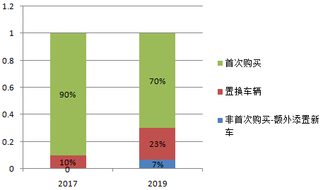 而這種趨勢并非空穴來風。麥肯錫在2019年的調(diào)查數(shù)據(jù)顯示,在受訪的購車者中,置換或買第二輛車的比例高達30%,比2017年提高了20%。此外,在購置下一輛車時,70%以上的受訪者會選擇購買更高端的車型。