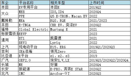 傳統(tǒng)車企的電動化專用平臺車型2020年下半年開始陸續(xù)上市
