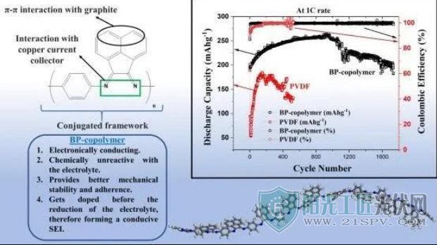與傳統(tǒng)的PVDF粘合劑相比,BP粘合劑可為負(fù)極提供更好的粘合性和機(jī)械穩(wěn)定性。其次,BP共聚物相比PVD更具導(dǎo)電性,并可產(chǎn)生一個(gè)更薄、且電阻更小的導(dǎo)電固體電解質(zhì)界面。同時(shí)BP共聚物不容易與電解質(zhì)發(fā)生反應(yīng),大大避免降解。