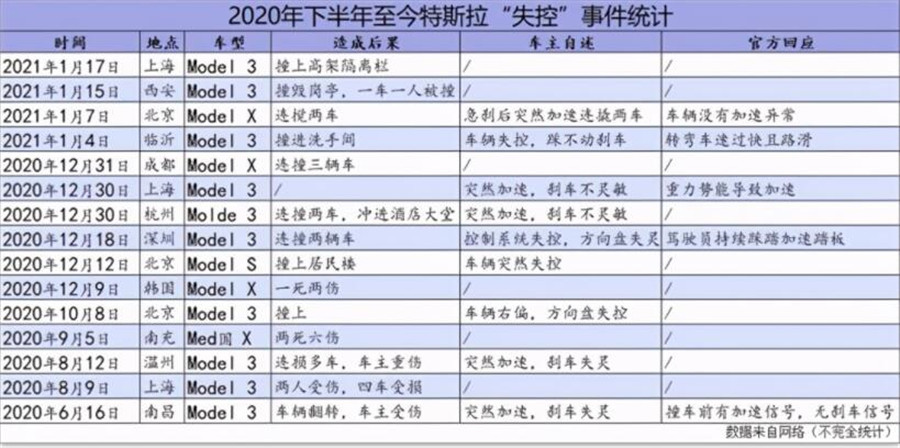 統(tǒng)計自2020年6月以來和特斯拉“行駛中突然加速”相關(guān)的事件和事故,僅公開報道的就已達數(shù)十條。