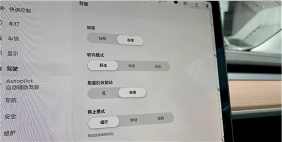 圖注:“單踏板功能”在特斯拉的系統(tǒng)中,其實并不是一個“功能”,而是一組選擇。當“動能回收”設(shè)置為標準,“停止模式”設(shè)置為保持,就是常說的單踏板模式了