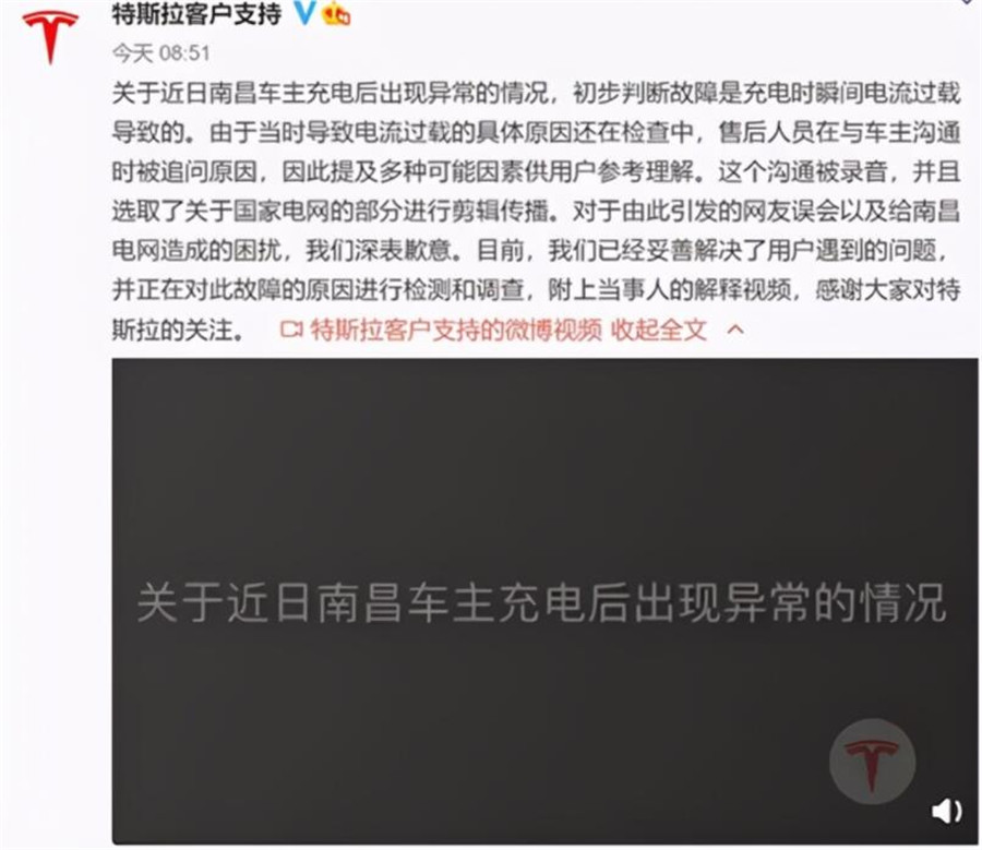 而說出“國家電網(wǎng)電流太大”這句話的特斯拉售后,也專門錄制說明視頻,公開承認責任在己。
