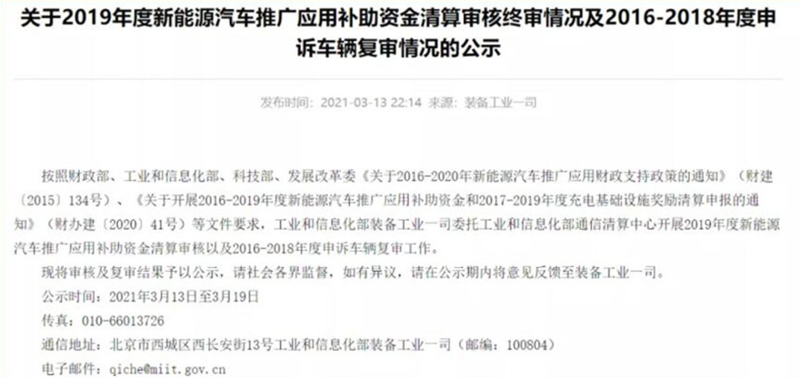 同時,工信部還對2016-2018年度申訴車輛復審情況進行了公示,分別將最終核定補助資金34萬元、1.35億元和7.43億元。
