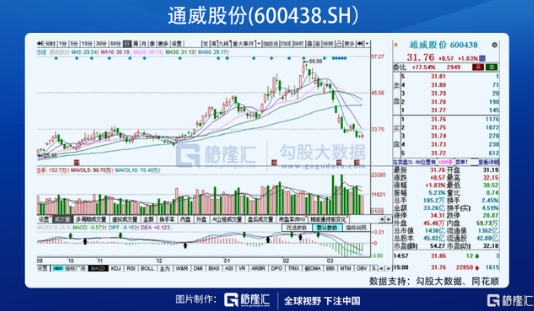 通威周一跌近8%,兩天交易日基本橫盤;通威受顆粒硅和2020Q4減值事件影響,從最高點(diǎn)下來,跌近43%。