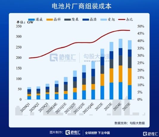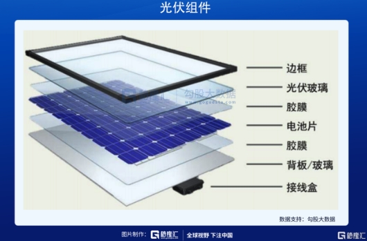 電池片生產(chǎn)完成后和支架、光伏玻璃、光伏膠膜等材料,組裝成組件;組件環(huán)節(jié)的玩家有隆基股份、晶科能源、晶澳科技等企業(yè)。