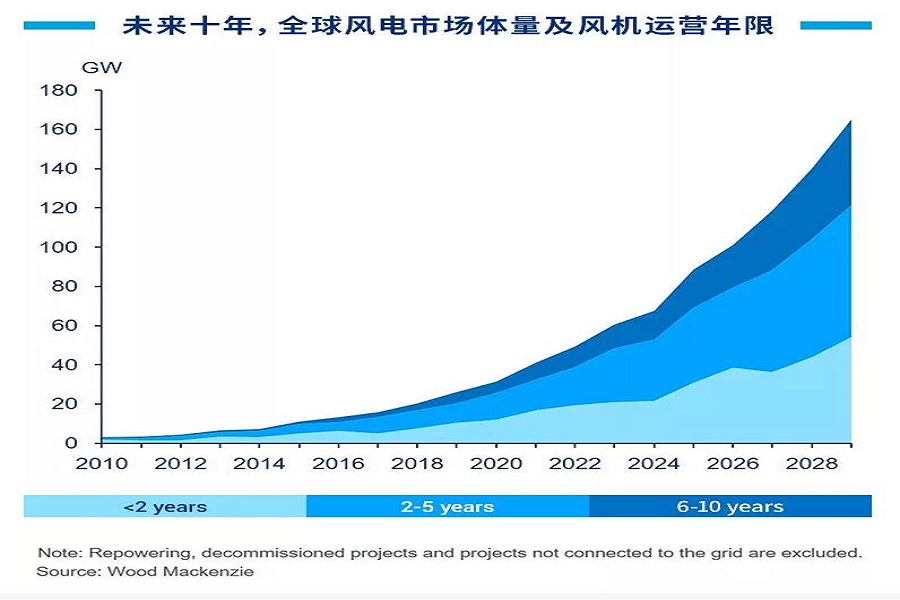 全球海上風電運維市場仍未成熟,在面臨長期運維問題與機組故障時缺乏經驗。目前,全球僅1.8GW的海上風電項目運營時長超過10年。預計至2029年,該容量將增至約20GW。然而,屆時近90%的在運行機組(即165GW容量)運行時長仍將不足10年。