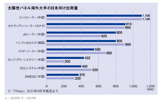 日本權(quán)威行業(yè)媒體PVEye旗下市調(diào)機構(gòu)近日發(fā)布2020年日本組件出貨量市場報告,數(shù)據(jù)統(tǒng)計顯示,晶科能源以1.1GW銷量,持續(xù)穩(wěn)居日本市占龍頭地位,并且是唯一一家去年出貨量超過1GW的品牌,排名第二為阿特斯,出貨量910MW,晶澳以800MW位居第三,隨后依次是韓華、天合。