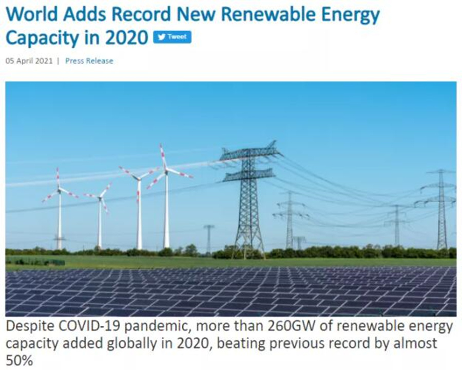 據國際可再生能源機構(IRENA)剛剛發布的《 2021 年可再生能源統計》,雖然發生了 COVID-19 疫情,2020年全世界增加了超過 260 吉瓦(GW)的可再生能源裝機容量,比 2019年的增長量增加了近 50%,新增可再生能源裝機容量創歷史新高。