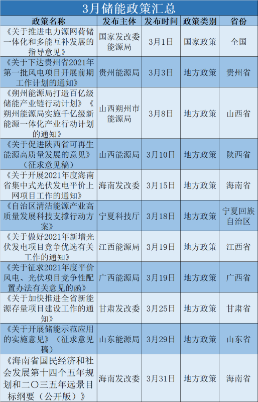尤其進入2021年以來,儲能相關政策頻出。根據「儲能之聲」不完全統計,2021年1-3月,我國已大大小小頒布了28項儲能相關政策。