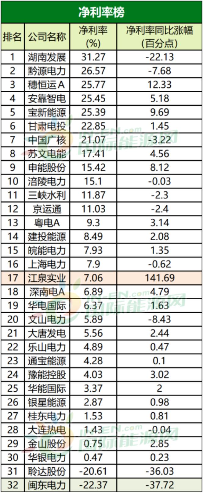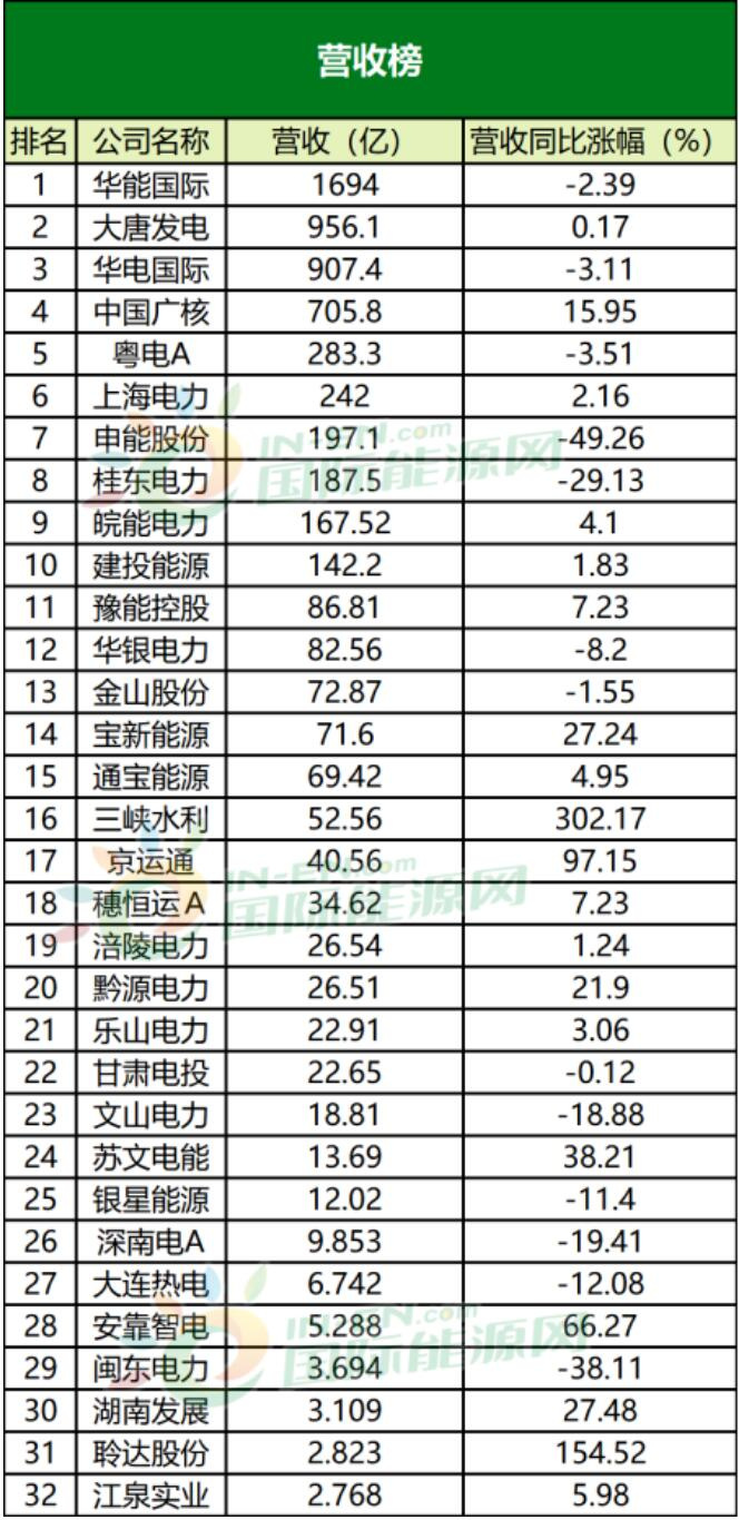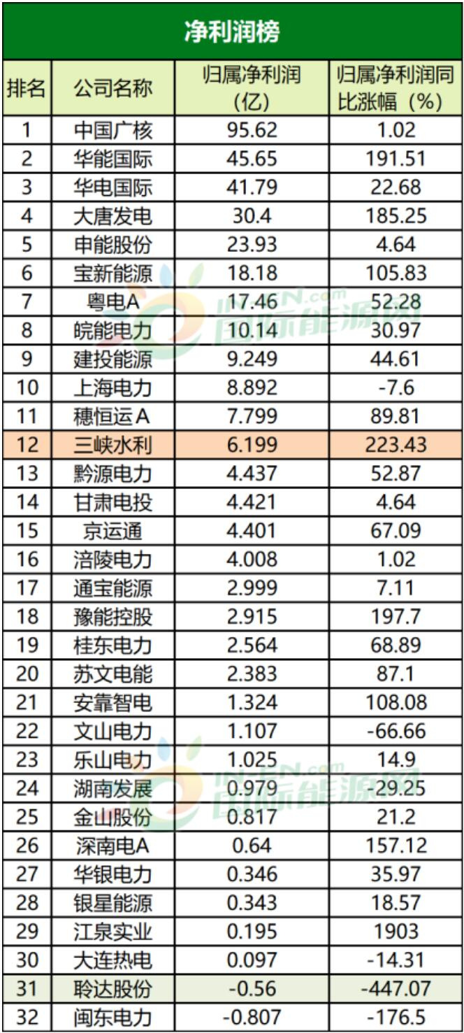 三峽水利雖然在歸屬凈利潤榜上僅僅排在第十二名,但從其同比的增速看,三峽水利的歸屬凈利潤增速是32家公司中最高的。另一家華能國際的歸屬凈利潤漲幅也非常高,這是因為公司通過研判煤炭市場走勢、優化采購策略、區域供應結構,加強與重點供應商合作的力度。節約了煤炭的成本,在供熱領域業務增幅也是讓公司歸屬凈利潤大幅增加的重要原因。