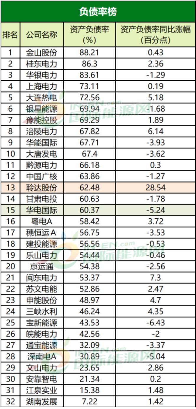 負債率是衡量公司財務狀況的重要指標,對企業來說:一般認為,資產負債率的適宜水平是40%~60%之間是比較健康的。但從32家電力公司的負債率榜我們不難發現,前五名的公司的負債率水平明顯高于安全水平。負債率過高,說明公司償債能力差,融資成本高,公司需要警惕財務風險。