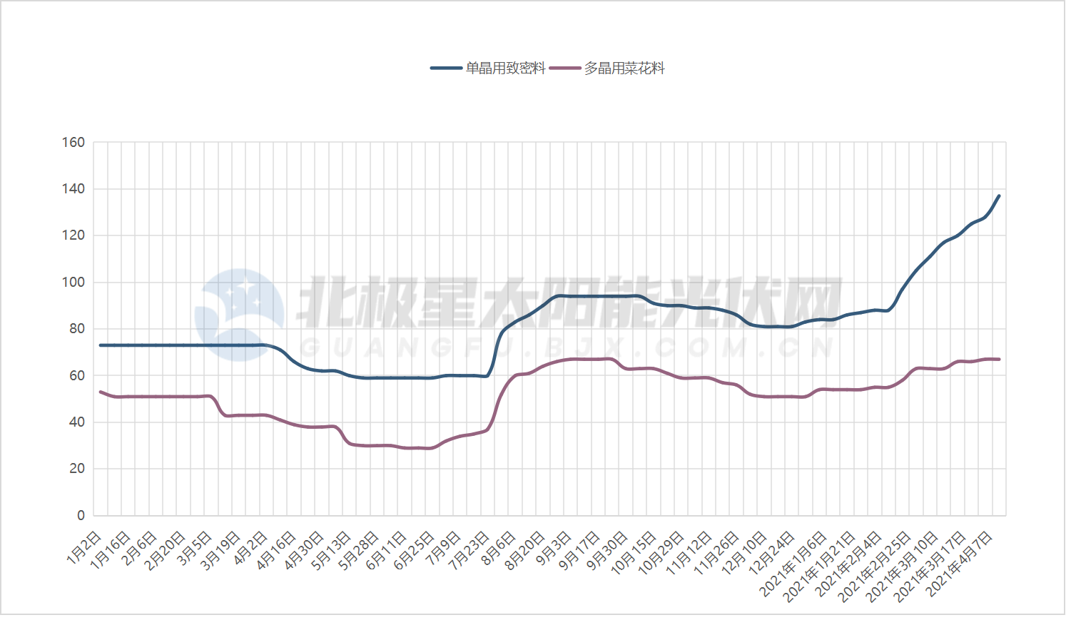 據(jù)北極星太陽(yáng)能光伏網(wǎng)跟蹤PVInfoLink每周報(bào)價(jià),從去年底至今,多晶硅料價(jià)格一路走高,本周單晶用致密料均價(jià)137元/kg,較年初上漲65%,高價(jià)沖破140漲至145元/kg;多晶用菜花料最高價(jià)77元/kg,市場(chǎng)均價(jià)67元/kg,較年初上漲31%。
