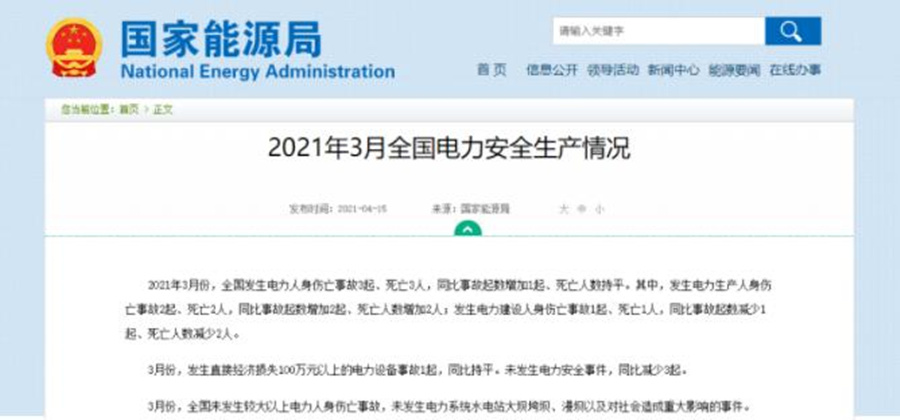 2021年3月份,全國發生電力人身傷亡事故3起、死亡3人,同比事故起數增加1起、死亡人數持平。其中,發生電力生產人身傷亡事故2起、死亡2人,同比事故起數增加2起、死亡人數增加2人;發生電力建設人身傷亡事故1起、死亡1人,同比事故起數減少1起、死亡人數減少2人。