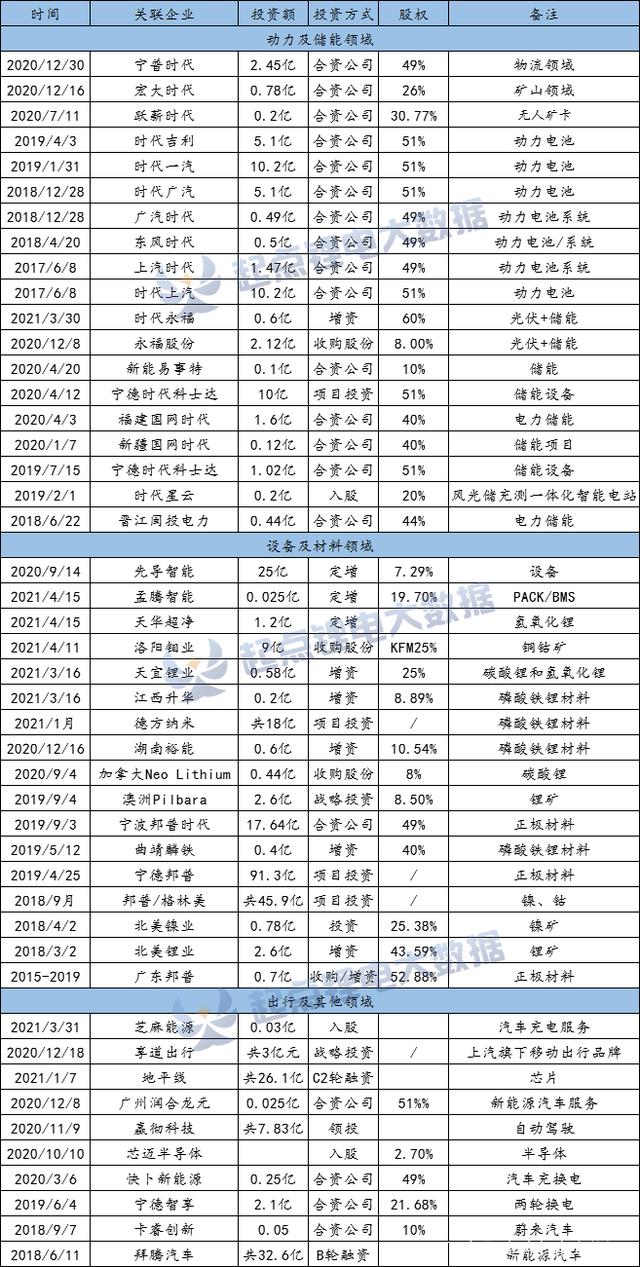 據(jù)起點(diǎn)鋰電大數(shù)據(jù)統(tǒng)計(jì),2018年以來(lái),寧德時(shí)代對(duì)外投資及合資成立的企業(yè)超過(guò)45家,設(shè)立的全資子公司超過(guò)10家,這些企業(yè)分布在動(dòng)力電池、儲(chǔ)能、鋰電池材料、鋰電池智能裝備制造、充換電、自動(dòng)駕駛、新能源汽車(chē)、乃至芯片、半導(dǎo)體等多個(gè)領(lǐng)域。算上在各領(lǐng)域的項(xiàng)目投資,寧德時(shí)代投資帝國(guó)已砸入超2000億元。