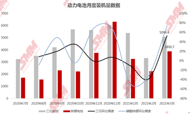 而從材料類型劃分來(lái)看,3月我國(guó)動(dòng)力電池市場(chǎng)三元電池仍然占據(jù)主導(dǎo)地位,三元電池共計(jì)裝車5.1GWH,同比上漲129%,環(huán)比上升53.1%。而磷酸鐵鋰電池裝車3.9GWH,同比上升627.9%,環(huán)比上升73.7%。