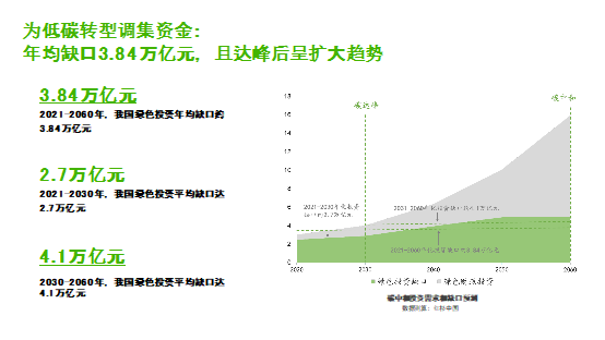 依據(jù)紅杉“零碳報告”,2021-2060年,我國綠色投資年均缺口約3.84萬億。其中,2021-2030年,我國綠色投資平均缺口達2.7萬億元,2030-2060年,我國綠色投資平均缺口達4.1萬億元。