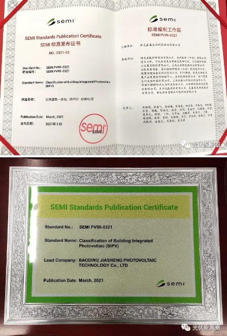 該標準由保定嘉盛光電科技股份有限公司(下稱“嘉盛光電”)主編。“這是SEMI中國光伏標委會BIPV工作組成立后正式發布的首個標準,是SEMI產業標準中的首個中國BIPV標準,也是嘉盛光電主編的首個國際標準。”嘉盛光電總經理張翼飛介紹,“標準發布實施將對BIPV產業規范發展產生重要影響,填補中國企業參與該行業標準編制的空白,標志著我國BIPV行業正在從國際標準制定的跟隨者開始向標準制定的并跑者轉變。”