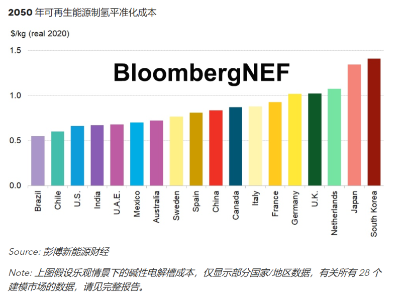 彭博新能源財經將2030年可再生能源制氫成本的預測下調13%、2050年預測下調17%。可再生能源制氫成本到2030年將遠低于2美元/千克,2050年在絕大多數市場中將遠低于1美元/千克。