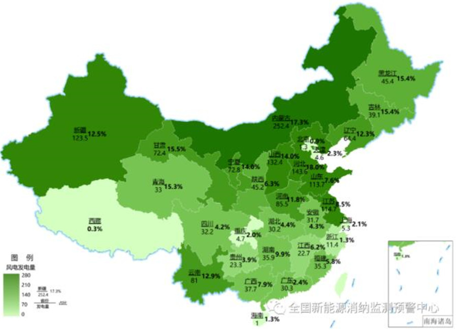 截至3月底各地區(qū)累計風電發(fā)電量(億千瓦時)及占本地區(qū)總發(fā)電量比重
