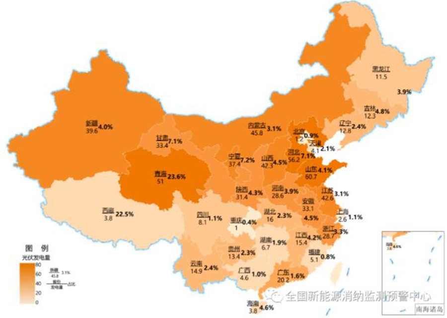 截至3月底各地區(qū)累計光伏發(fā)電量(億千瓦時)及占本地區(qū)總發(fā)電量比重