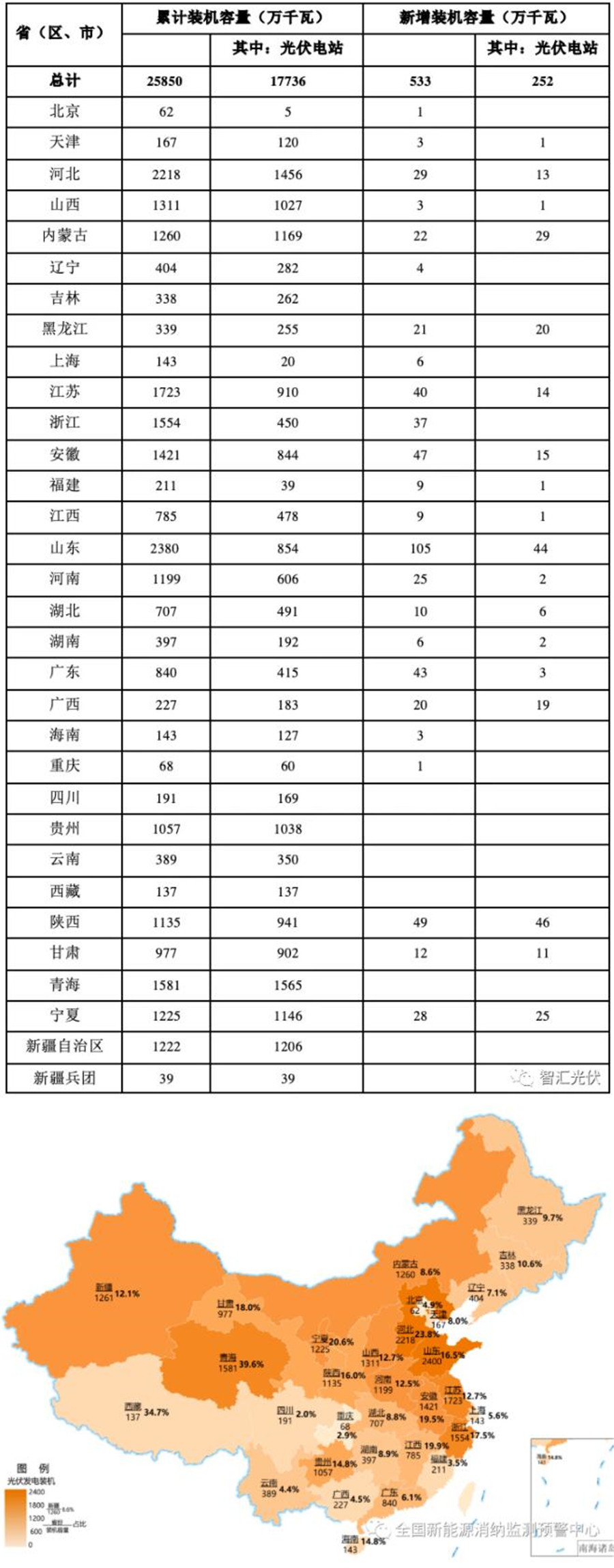截至3月底,全國光伏并網(wǎng)裝機2.59億kW。全國各省新增、累計光伏裝機如下表所示。