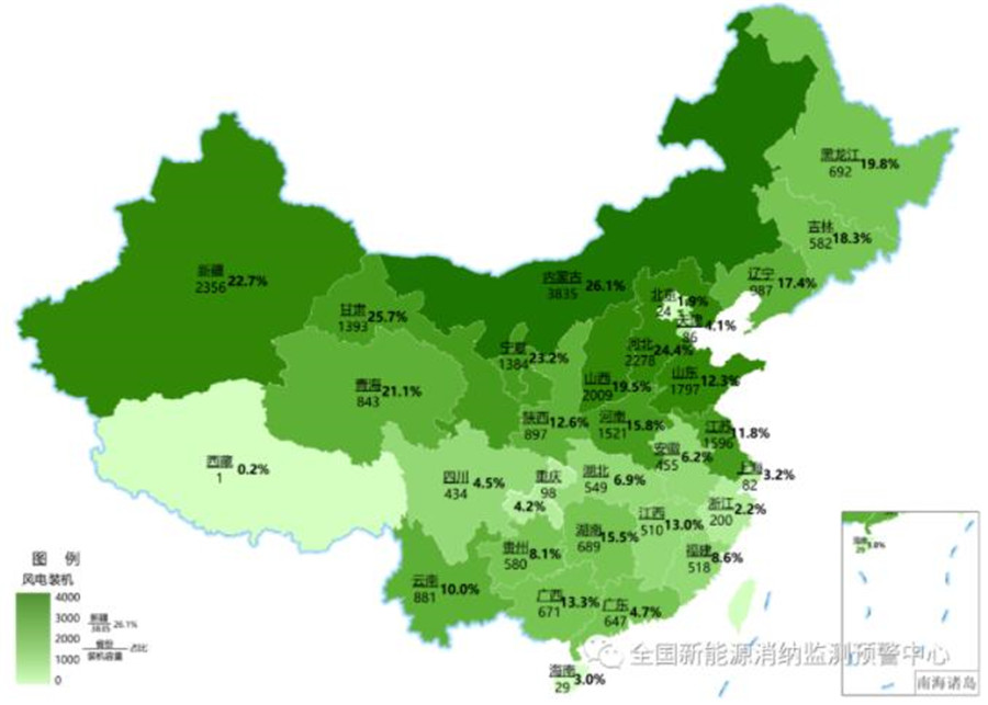 截至3月底各地區(qū)累計風電裝機(萬千瓦)及占本地區(qū)總裝機比重