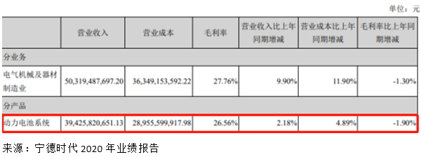 根據(jù)動(dòng)力電池289.56億元的營(yíng)業(yè)成本來看,寧德時(shí)代2020年動(dòng)力電池系統(tǒng)的平均單價(jià)成本約為0.65元/Wh,而2019年寧德時(shí)代的這一數(shù)字為0.67元/Wh,下降幅度很小。作為比較,2018年寧德時(shí)代動(dòng)力電池系統(tǒng)的平均成本為0.758元/Wh,2019年較2018年下降較為明顯,而2020年較2019年下降區(qū)間大幅收窄。