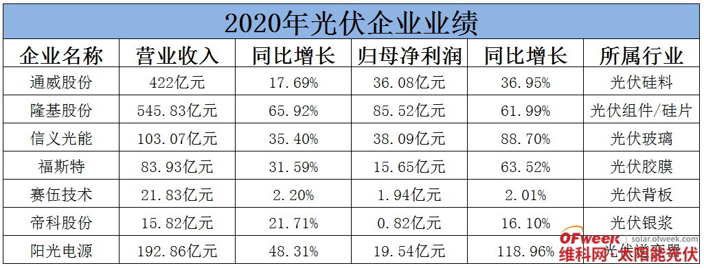 OFweek太陽能光伏網,根據2019年市場份額及2020年的動態表現,結合各企業年度報告進行匯總。從上至下篩選出了光伏硅料、光伏硅片、光伏逆變器、光伏玻璃、光伏背板、光伏膠膜、光伏銀漿的龍頭企業。通過2020年的業績表現,看看哪個環節更賺錢?