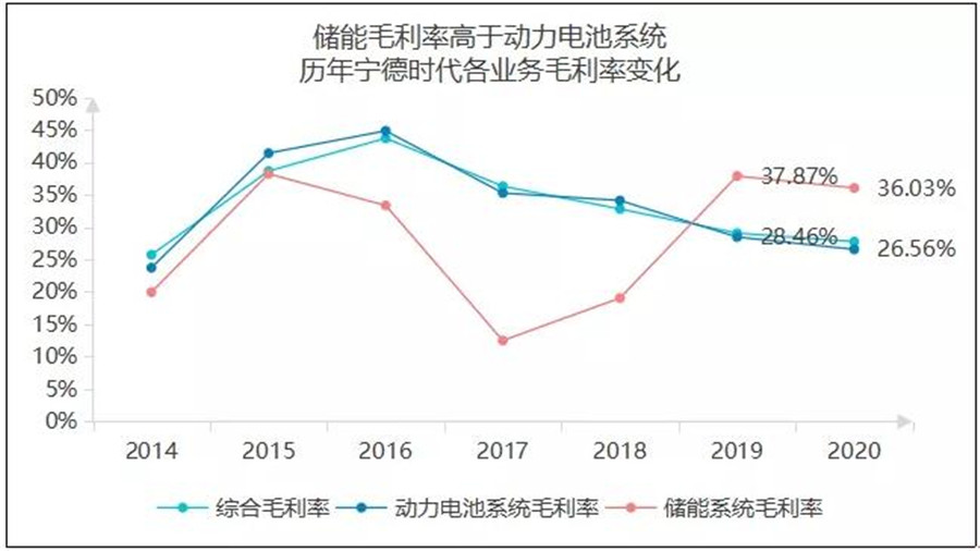 2019年和2020年,動力電池系統(tǒng)的毛利率為28.46%和26.56%,而儲能系統(tǒng)的毛利率分別為37.87%和36.03%。
