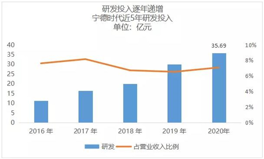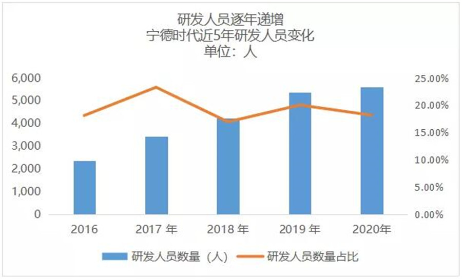 2020年,寧德時代研發(fā)在營收中的占比達到7.09%,擁有研發(fā)技術人員5592 名。