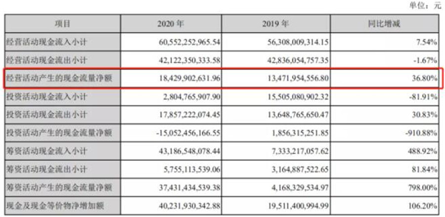 不過,寧德時代現(xiàn)金流非常充裕。2020年,寧德時代經(jīng)營性現(xiàn)金流為184.30 億元,同比增長36.8%,為凈利潤的3.02 倍,其中2020第四季度經(jīng)營性現(xiàn)金流為 81.24 億元,同比增長158.1%,環(huán)比增長81%;報告給出的原因是,主要是產(chǎn)品銷售情況良好,部分客戶支付預付款。