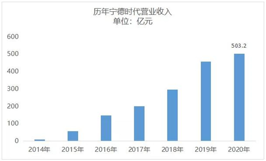 2020年,寧德時代實現(xiàn)營業(yè)總收入503.2億元,同比增長9.90%,歸屬于上市公司股東的凈利潤為55.8億元,同比增長22.43%。