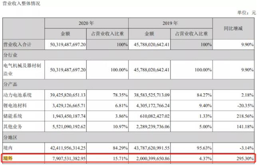 2020年,寧德時代境外業(yè)務營收為79.08億元,營收占比達到15.71%,而2019年這一數(shù)字僅為4.37%,同比大增295.30%。