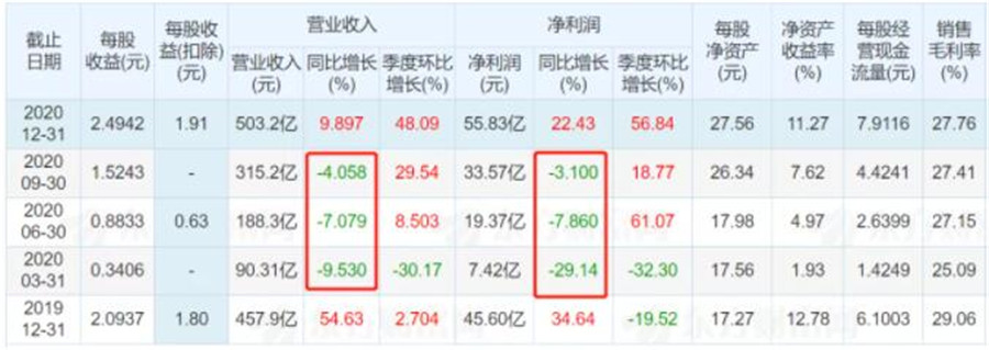 2020年受疫情影響,寧德時代前三季度的營業(yè)收入同比下滑明顯,凈利潤也處于同比負增長。