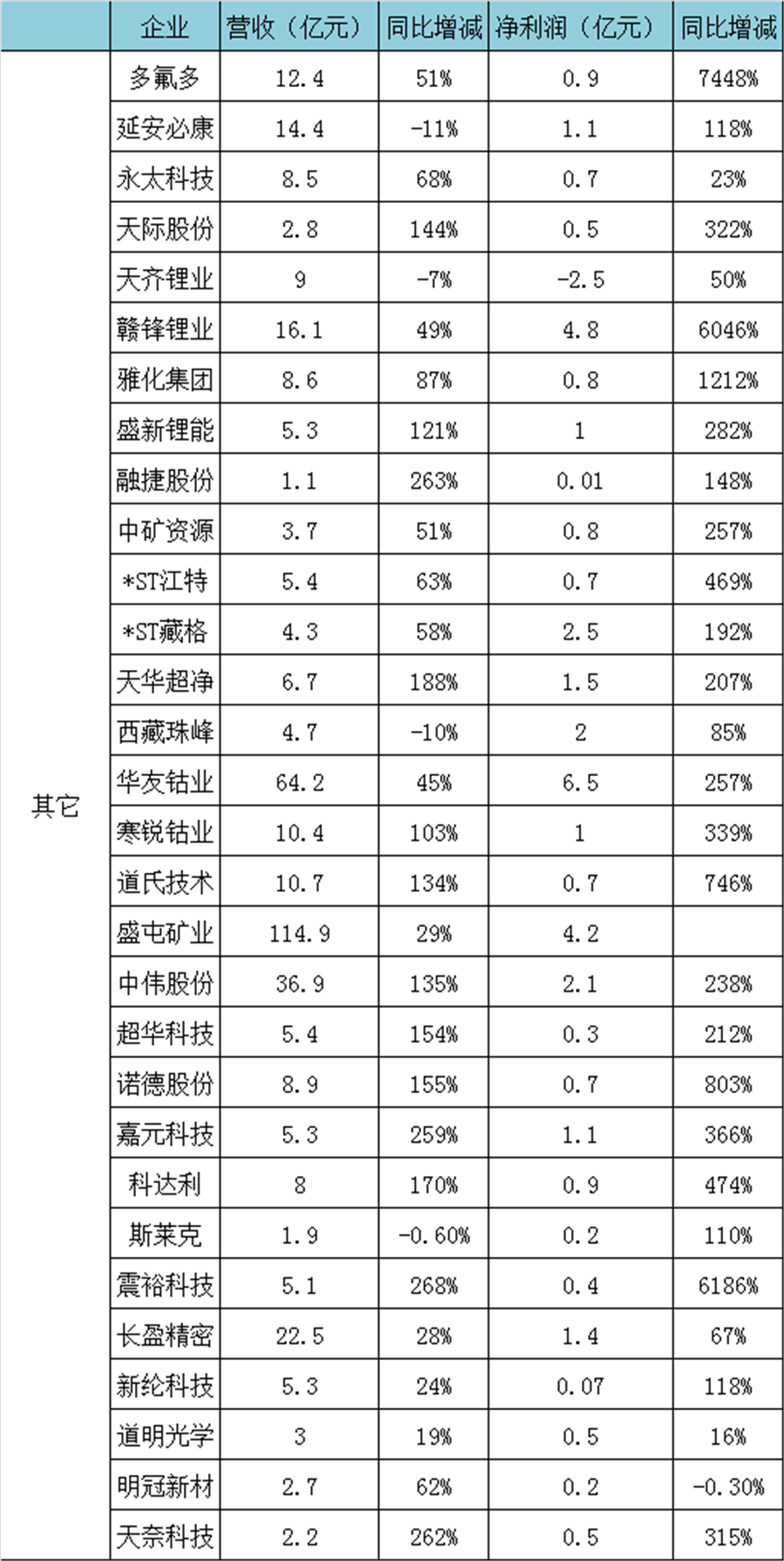 除了鈷鋰之外,包括六氟磷酸鋰、前驅體、銅箔、結構件、鋁塑膜、導電劑等其它鋰電材料的市場需求也出現大幅增長,帶動上述材料領域上市企業業績增長。