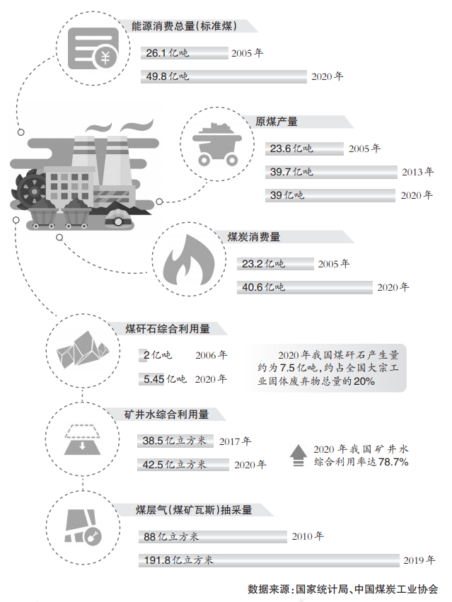 國家統計局數據顯示,近年來,我國煤炭生產和消費量隨經濟社會快速發展而大幅增長,能源消費總量由2005年的26.1億噸標準煤增至2020年的49.8億噸標準煤。全國原煤產量2005年為23.6億噸,2013年達到階段峰值39.7億噸。此后煤炭產量雖有回落,但2020年仍達到39億噸。據國家統計局相關數據測算,煤炭消費量由2005年的23.2億噸增至2020年的40.6億噸。