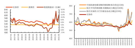 根據(jù)國內(nèi)主流煤炭企業(yè)公告,2021年長協(xié)煤價基準(zhǔn)價為535元/噸為基準(zhǔn)價,浮動價參考環(huán)渤海BSPI、秦皇島CCTD、沿海電煤采購價格CECI三大煤炭指數(shù)(各家煤炭企業(yè)選取的參照指數(shù)略有不同)。